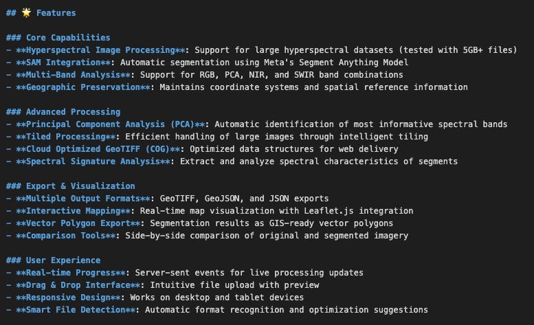 For the Earth Observation geeks in my readership: I built an application to recieve a dragged hyperspectral image up to 5GB, then tile appropriately for visualization, then apply a PCA analysis to the bands of the image which are typically outside the wavelengths detectable by the human eye, then run Meta’s “Segment Anything” algorithm over the result and show the original image, the PCA output, and the Segment Anything output as three layers on a slippy map for visualization. The idea being that I was building a visualization of our invisible planet. Well, invisible to us humans. A fun little art project.