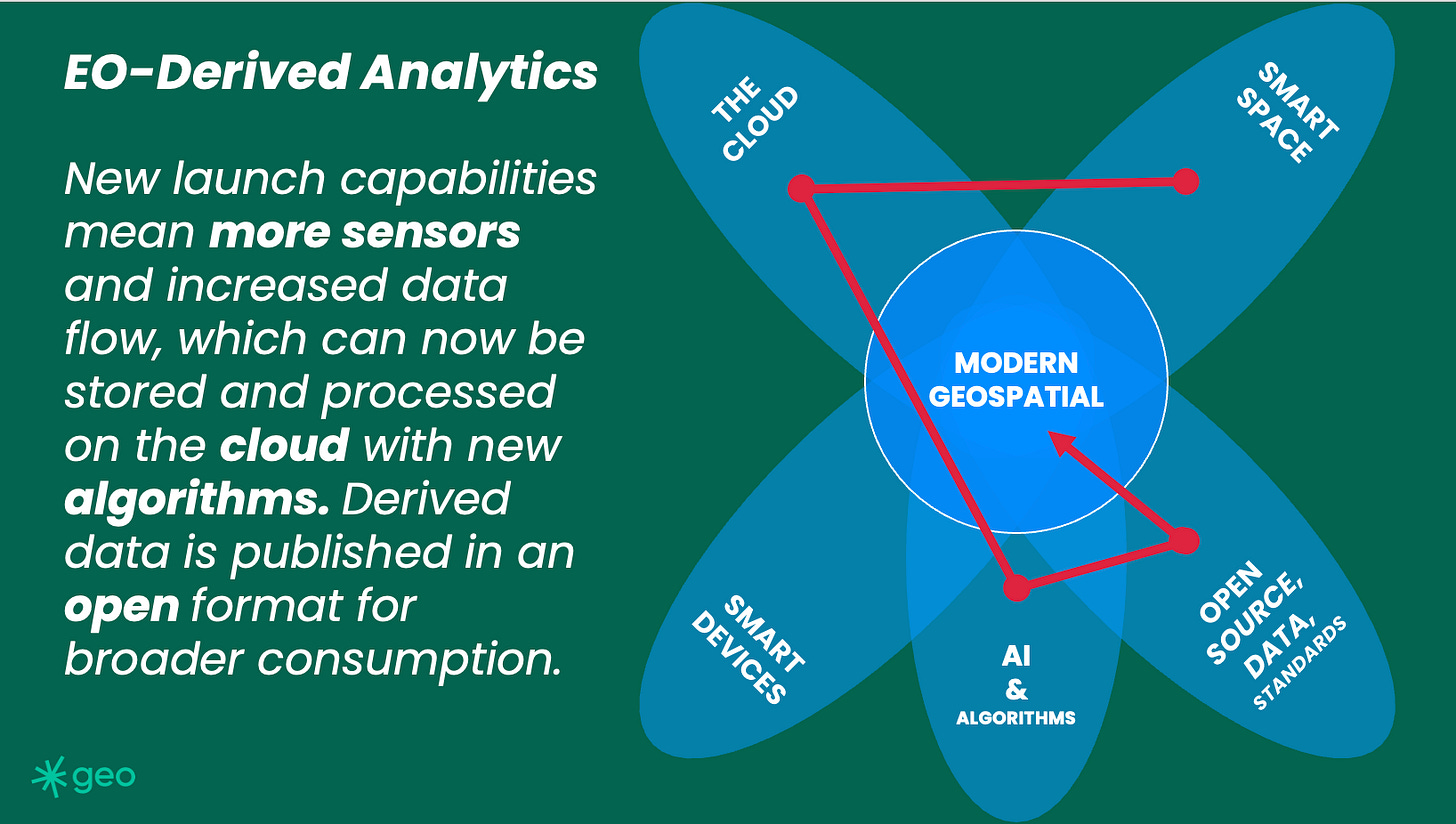 As discussed, there are gazillions of satellites in the sky right now. This constellation of sensory capacity downlinks TBs of data every day, indeed, every hour. The net result is a massive amount of data being stored "somewhere." Which is entirely useless without the ability to search, find or read it. However, now we can do this. There is technology to catalogue and search vast troves of imagery, vector, and IoT data. Spatio-Temporal Asset Catalogues immediately come to mind.