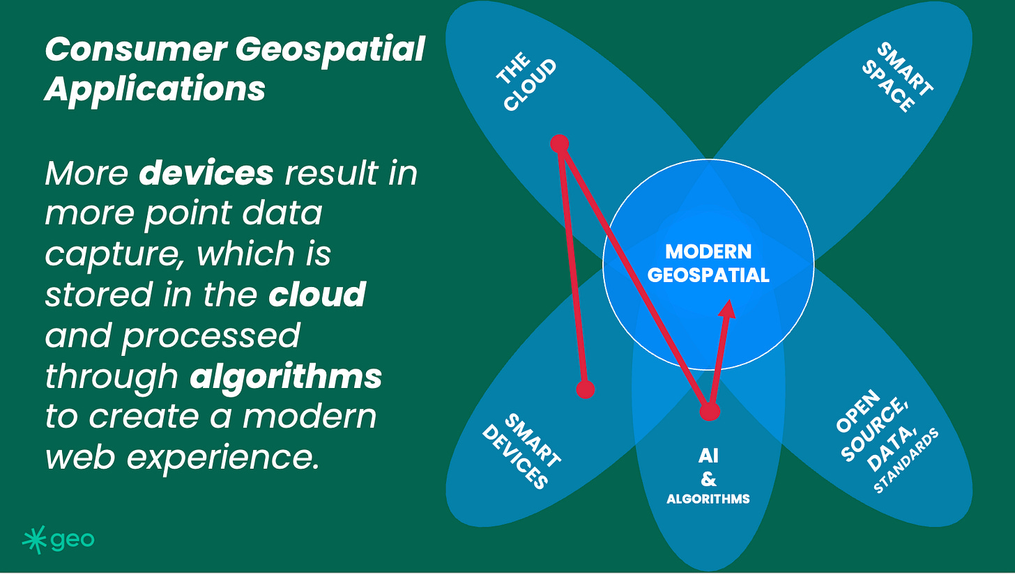 We can create computing chains of events which automatically transform data into insight. This could be driven by any number of data sources, spatial or otherwise, but having sensory networks detect and deliver insight to numerous users is an actual capability. Think wildfire alerts or delivery proximity notifications.